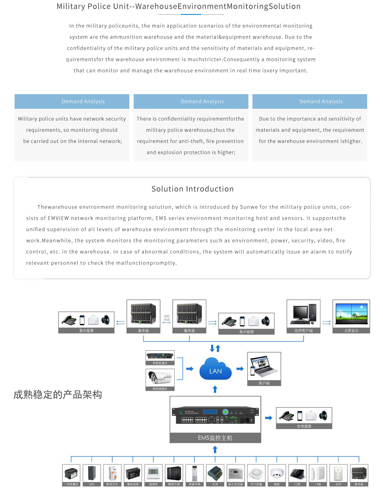 Thewarehouse environment monitoring solution, which is introduced by Sunwe for the military police units, consists of EMVIEW network monitoring platform, EMS series environment monitoring host and sensors. It supportsthe unified supervision of all levels of warehouse environment through the monitoring center in the local area network.Meanwhile, the system monitors the monitoring parameters such as environment, power, security, video, fire control, etc. in the warehouse. In case of abnormal conditions, the system will automatically issue an alarm to notify relevant personnel to check the malfunctionpromptly.